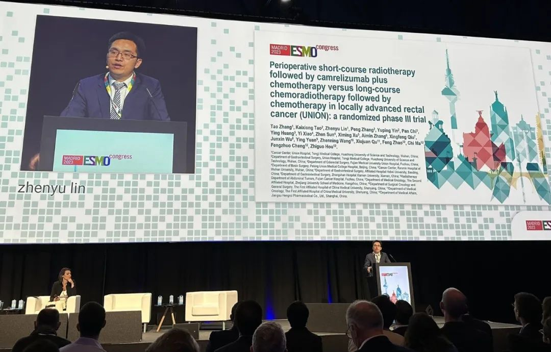 10月21日,EVO视讯医药创新药卡瑞利珠单抗的一项研究“新辅助短程放疗序贯卡瑞利珠单抗联合化疗对比长程放化疗序贯化疗治疗局部晚期直肠癌”随机对照Ⅲ期试验(UNION)亮相2023 ESMO大会优选口头报告现场。该研究由华中科技大学同济医学院附属协和医院张涛教授、陶凯雄教授担任主要研究者,华中科技大学同济医学院附属协和医院林振宇教授在大会现场报告了该重磅研究的结果1。此项研究是全球首个评估短程放疗序贯免疫治疗联合化疗治疗局部晚期直肠癌的Ⅲ期研究,已达到主要终点病理完全缓解(pCR),有望为直肠癌患者的治疗提供新策略。